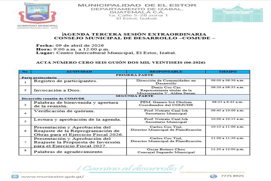 El día de hoy se desarrolló la tercera reunión extraordinaria del Consejo Municipal de Desarrollo – COMUDE-, bajo la coordinación del Sr. Alcalde; desarrollando diversos temas de interés e inversión para el bien común de nuestra sociedad, año fiscal 2027
